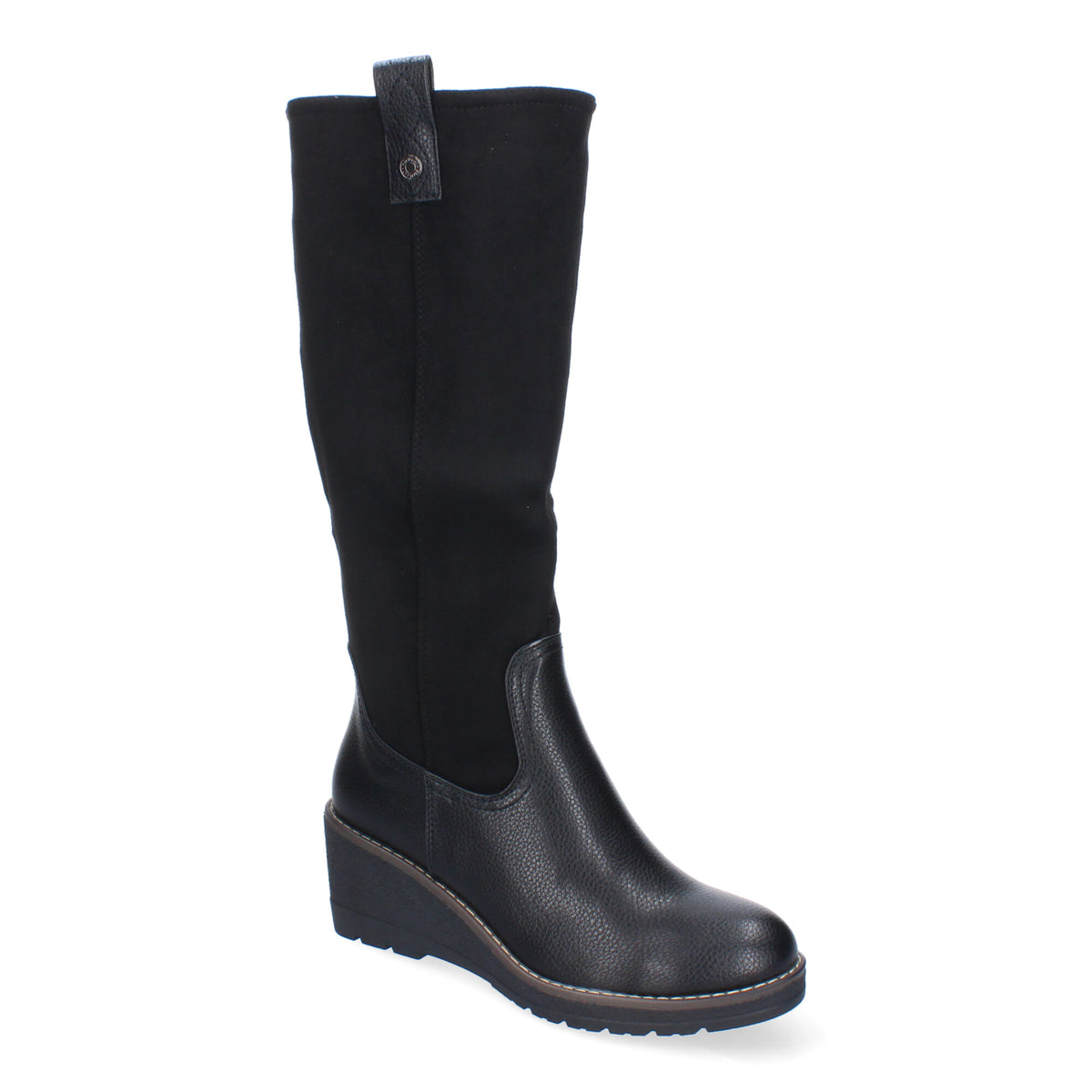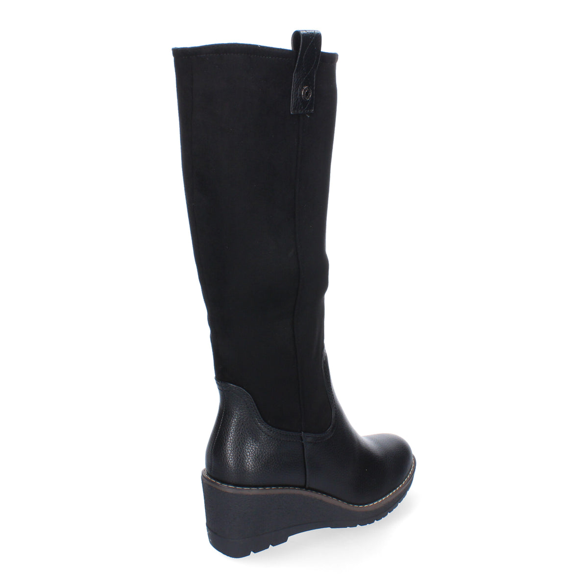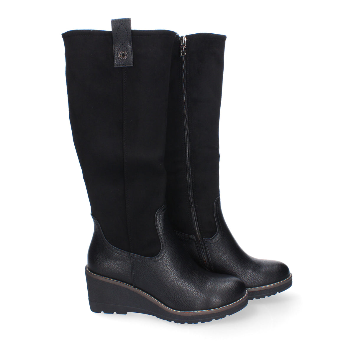 Estas botas negras de cuña para mujer destacan por su diseño elegante y funcional. La puntera redonda y el cierre de cremallera aseguran comodidad y practicidad, mientras que la caña alta añade un toque sofisticado. Con un talón de 6,5 cm y una plataforma de 1,5 cm, son ideales para complementar looks otoñales e invernales.