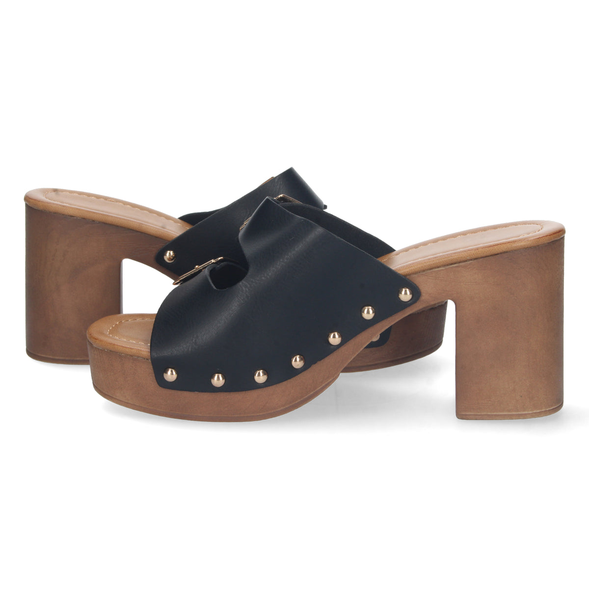 El nombre Hécate , figura central en la mitología griega, simboliza la independencia, la transformación y el dominio del camino propio. Como diosa de los cruces y las decisiones, representa a quienes avanzan con paso firme. Estas sandalias tipo zueco negras mujer encarnan esa fuerza, combinando estilo con funcionalidad. La imitación madera en la base aporta una estética natural, mientras las palas con hebillas, los remaches decorativos y el tacón de 9cm con plataforma de 3cm garantizan un equilibrio entre altura y confort.